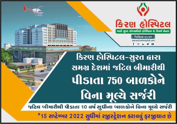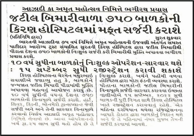 • This gave rise to the “Kiran Hospital Surat Jatil Baal Surgery Amrut Mahotsav” (Complex Child Surgery Amrut Mahotsav), marking a new milestone in healthcare service to the nation.